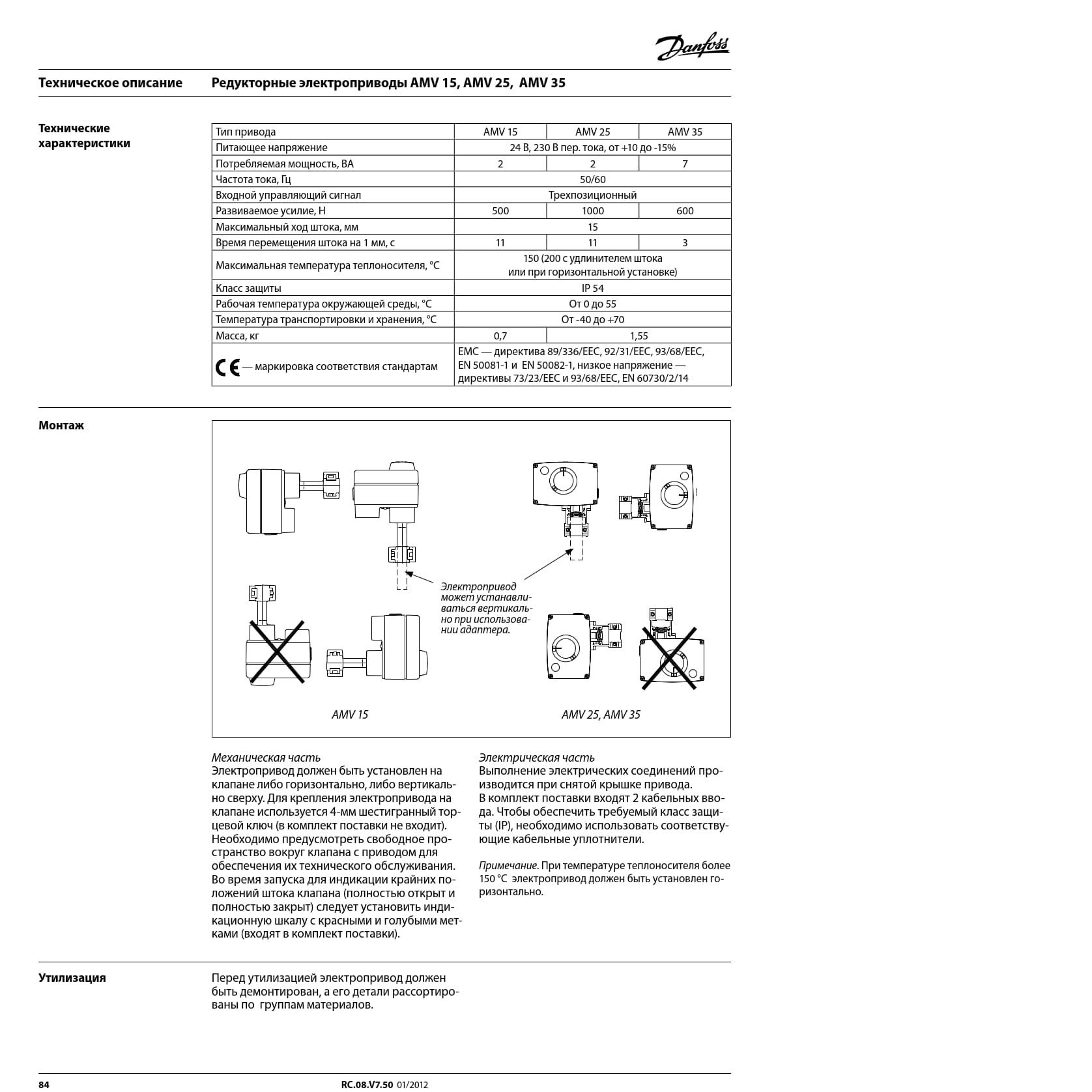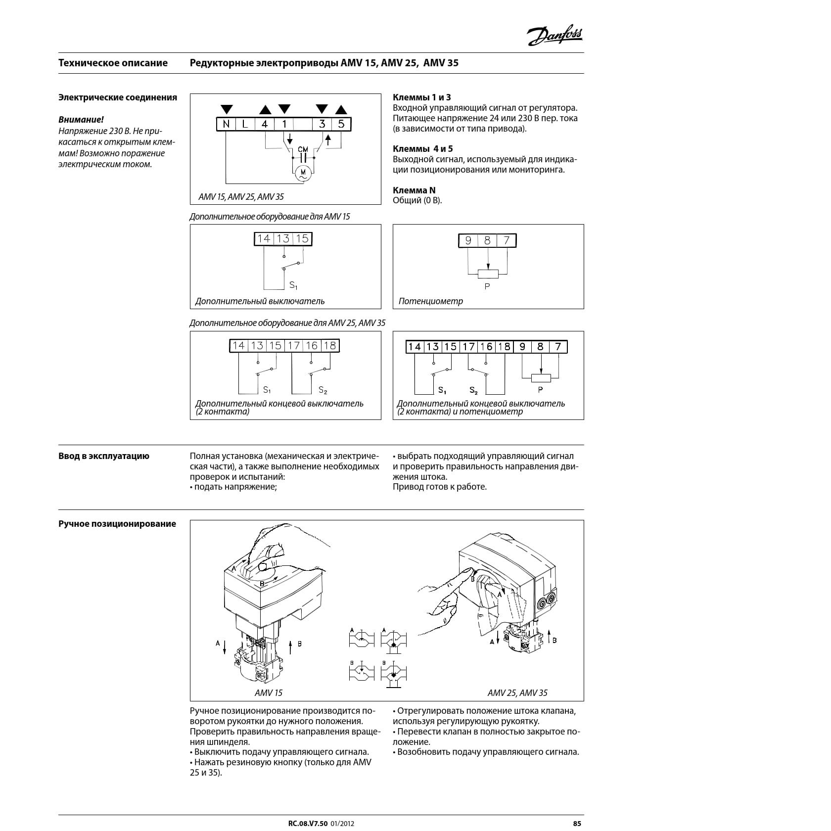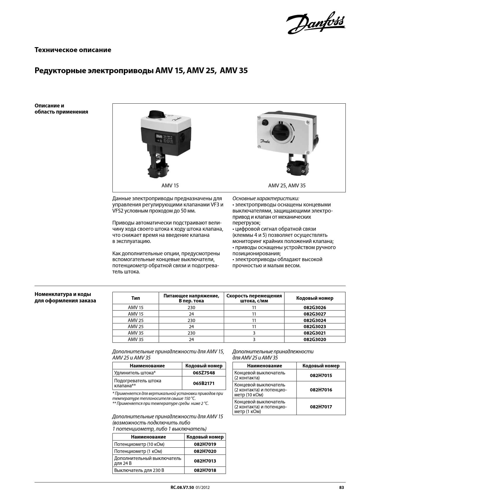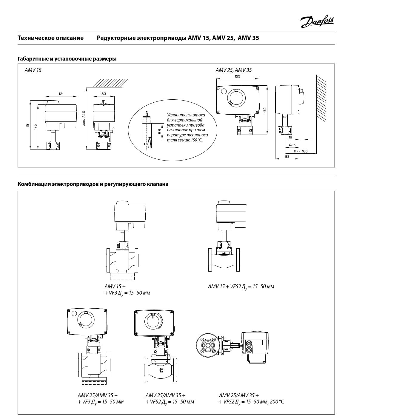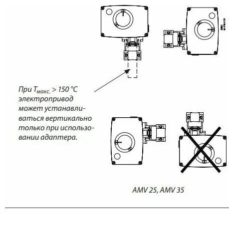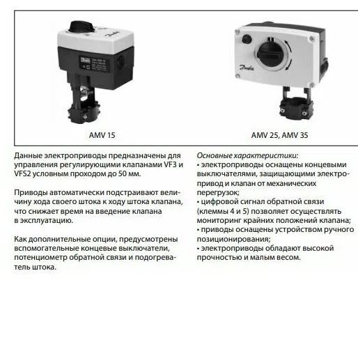 Данные электроприводы предназначены для управления регулирующими клапанами VF3 и VFS2 условным проходом до 50 мм. Приводы автоматически подстраивают величину хода своего штока к ходу штока клапана, что снижает время на введение клапана в эксплуатацию. Как дополнительные опции, предусмотрены вспомогательные концевые выключатели, потенциометр обратной связи и подогреватель штока. Редукторные электроприводы AMV 15,AMV 25, AMV 35 Основные характеристики: • электроприводы оснащены концевыми выключателями, защищающими электропривод и клапан от механических перегрузок; • цифровой сигнал обратной связи (клеммы 4 и 5) позволяет осуществлять мониторинг крайних положений клапана; • приводы оснащены устройством ручного позиционирования; • электроприводы обладают высокой прочностью и малым весом.
