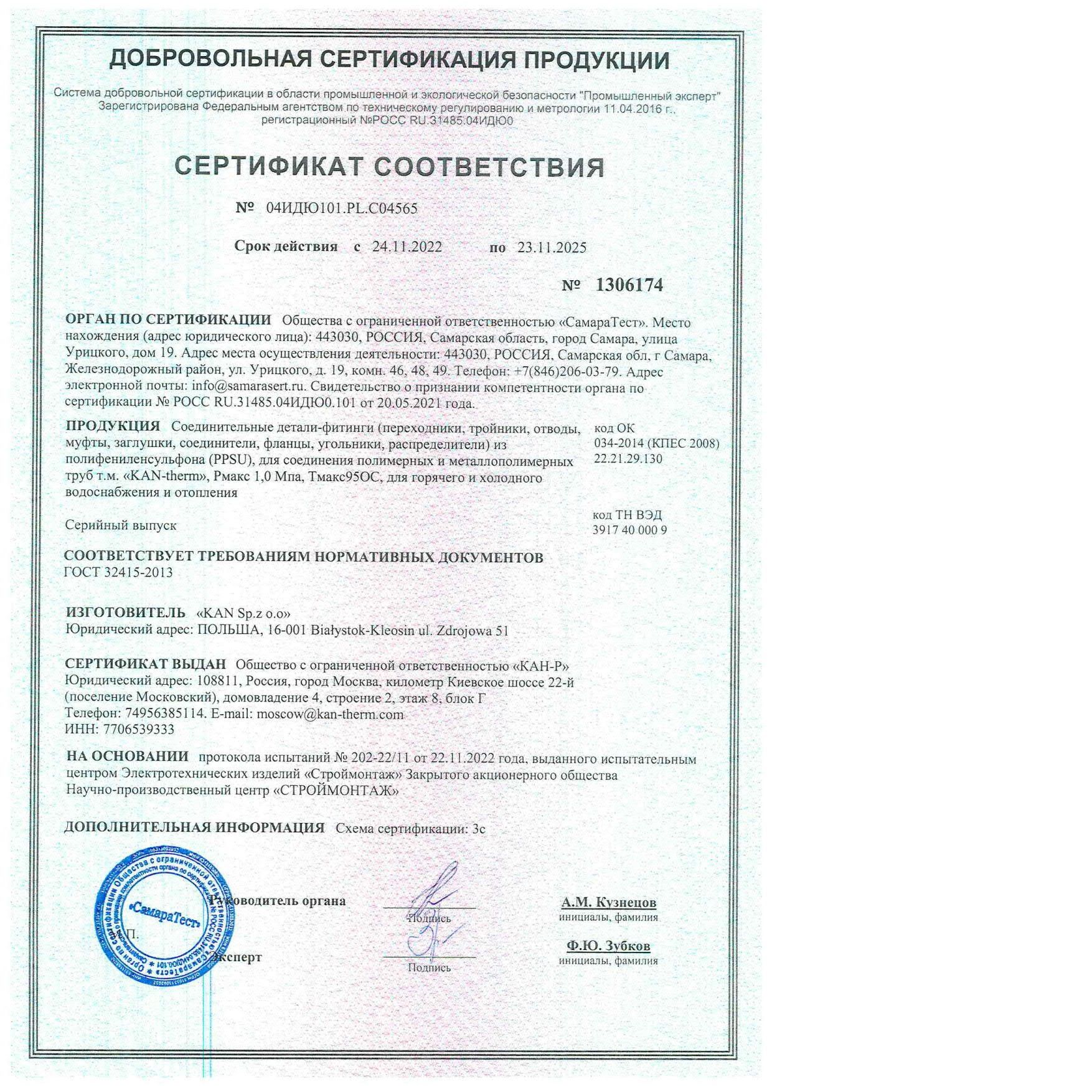Отвод Kan-therm Push PPSU представляет собой У-образную цельную конструкцию. Это комбинация из двух полых цилиндров с одинаковым диаметром отводов. Все части отвода имеют специальные штуцеры для монтажа пластиковых труб совместно с надвижной гильзой. Штуцеры имеют специальные выемки и выступы по внешней поверхности. Эти элементы позволяют обеспечить прочность и герметичность соединения.