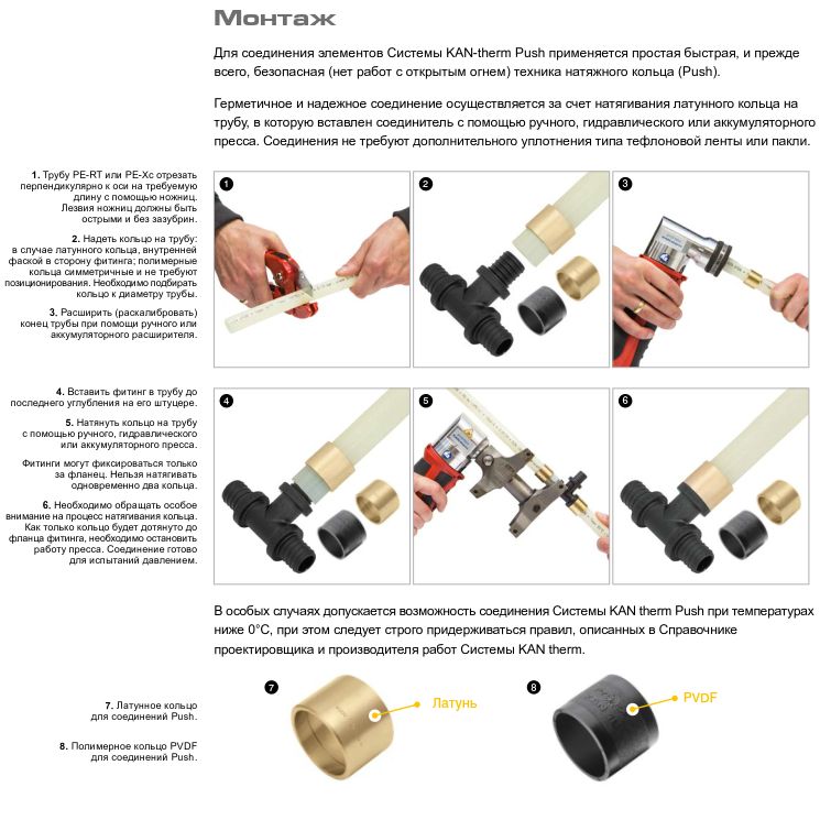 Соединение Push выполняется путем вставки соединителя в расширенный конец трубы, а затем натягивания латунного кольца с помощью ручного или гидравлического пресса. Эта техника не требует дополнительного уплотнения, гарантирует идеальную герметичность и прочность системы.