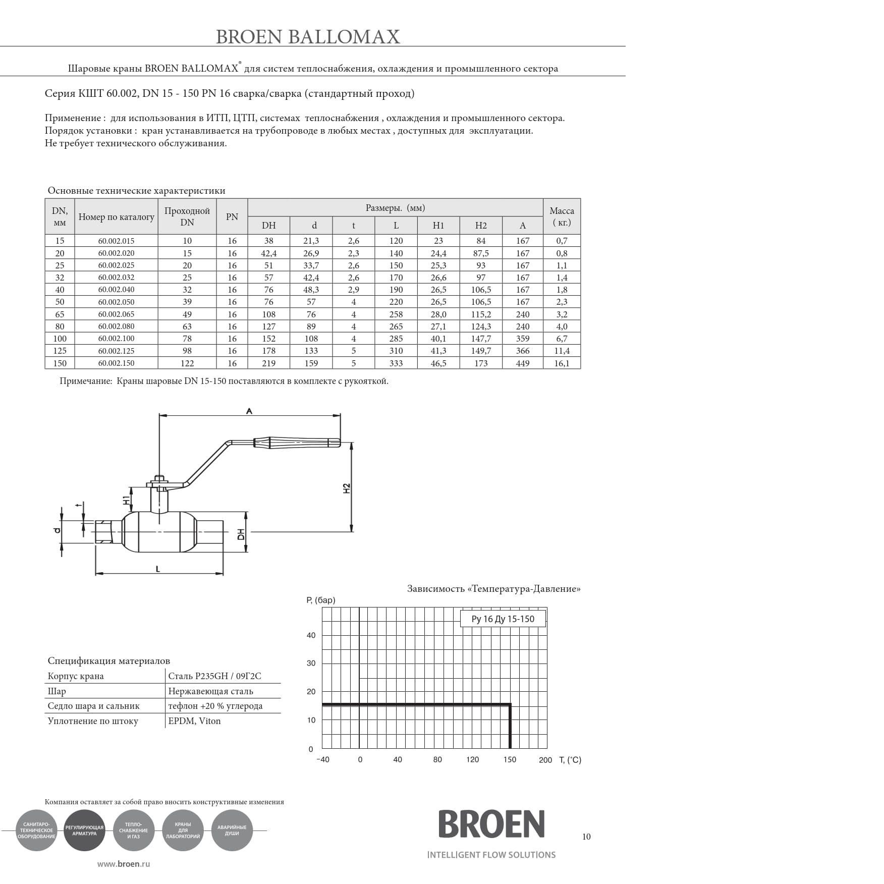 Корпус шаровых кранов BROEN BALLOMAX® изготовлен из углеродистой стали P235GH / 09Г2С. Основным рабочим элементом крана является шар, выполненный из нержавеющей стали. Седловое уплотнение шара выполнено из тефлона с содержанием 20 % углерода. Кроме этого, благодаря наличию тарельчатой пружины (Сталь пружинная Ck75(50CrV4)), удается компенсировать температурные расширения шара и исключить возможность протечек. Шток
