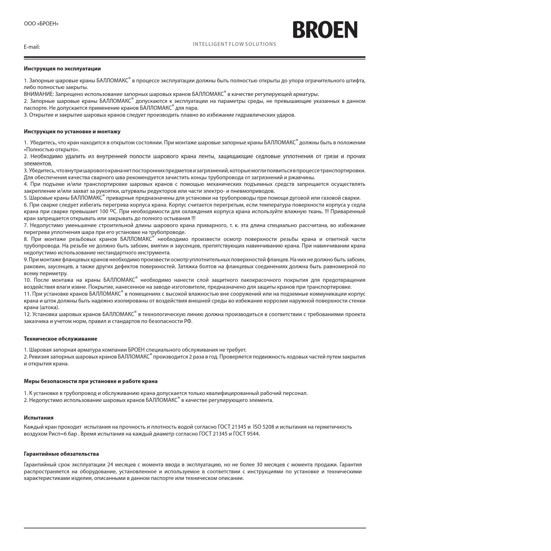 Краны шаровые BROEN BALLOMAX® типа КШТ предназначены для полного открывания или закрывания потока рабочей среды. Их нельзя применять в качестве дроссельной или регулирующей арматуры.
