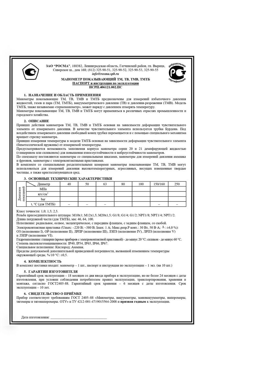 1. НАЗНАЧЕНИЕ И ОБЛАСТЬ ПРИМЕНЕНИЯ Манометры показывающие TM, TB, TMB и ТМТБ предназначены для измерений избыточного давления жидкостей, газов и пара (ТМ, ТМТБ), вакуумметрического давления (ТВ) и давления-разрежения (ТМВ). Модель ТМТБ, также называемая «термоманометр», может наряду с давлением измерять температуру. Манометры показывающие TM, TB, TMB и ТМТБ могут применяться в различных отраслях промышленности и городского хозяйства.