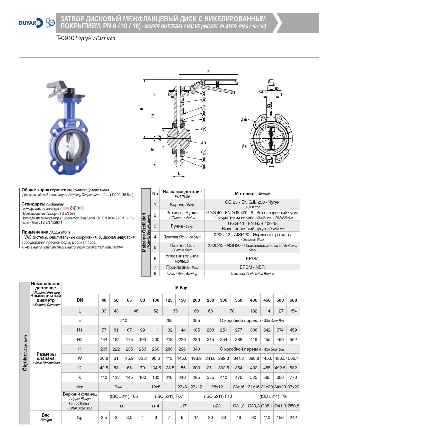 Затвор поворотный дисковый, с чугунным диском и никелированным покрытием, гарантирует 100% герметичность посредством установки затвора перпендикулярно оси трубопровода, диска вращающегося на четверть оборота (90 градусов) и внутреннего уплотнения.Устанавливается между 2 фланцами.Может использоваться в режиме регулирования, а также в режиме открыть-закрыть.Затворы комплектуются дисками из чугуна с никелированным покрытием и вкладышами EPDM, NBR или VITON в зависимости от состава и температуры рабочей среды.По сравнению с другими типами затворов, затворы типа «Баттерфляй» обладают рядом преимуществ: экономичный дизайн, т.е. состоят из меньшего количества частей, что в свою очередь облегчает монтаж и замену затворов. Дисковые затворы относительно легки в весе, уникальная конструкция позволяет экономить как и на самой стоимости продукта так и на затратах по установке и обслуживании затвора.Благодаря двойному штоку, потеря давления сводится к минимуму.Наружное и внутреннее эпоксидно-порошковое покрытие корпуса гарантирует стабильную работу даже в самых сложных условиях.Затвор абсолютно подлежит автоматизации. На затвор может устанавливаться как пневматический, так и электропривод. Верхний фланец позволяет монтаж приводов без дополнительных частей.ОБЛАСТЬ ПРИМЕНЕНИЯ: Холодное и горячее водоснабжение, пар, сточные воды, водораспределение, водоочистка, вентиляция, текстильная промышленность, химические среды, пищевая промышленность, нефть, газ.