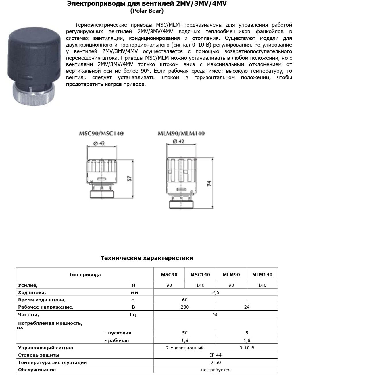 Термоэлектрические приводы Polar Bear MSC/MLM предназначены для управления работой регулирующих вентилей 2MV/3MV/4MV водяных теплообменников фанкойлов в системах вентиляции, кондиционирования и отопления. Существуют модели для двухпозиционного и пропорционального (сигнал 0–10 В) регулирования. Приводы MSC/MLM можно устанавливать в любом положении, но с вентилями 2MV/3MV/4MV только штоком вниз с максимальным отклонением от вертикальной оси не более 90°. Если рабочая среда имеет высокую температуру, то вентиль следует устанавливать штоком в горизонтальном положении, чтобы предотвратить нагрев привода.