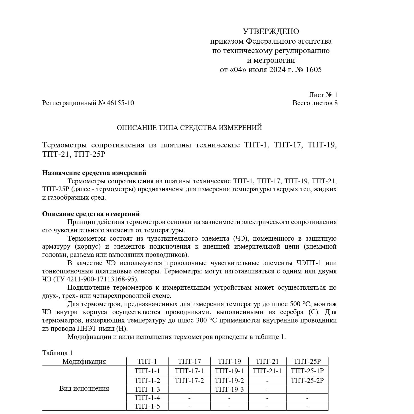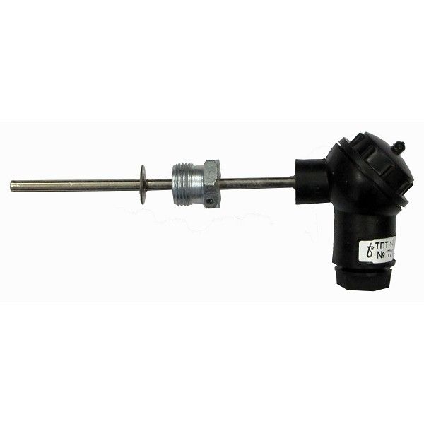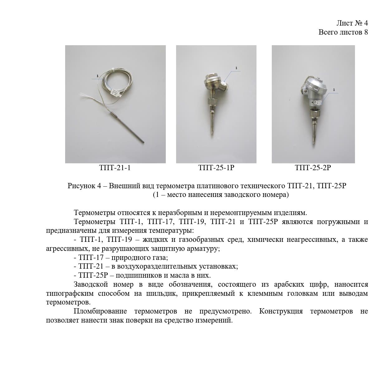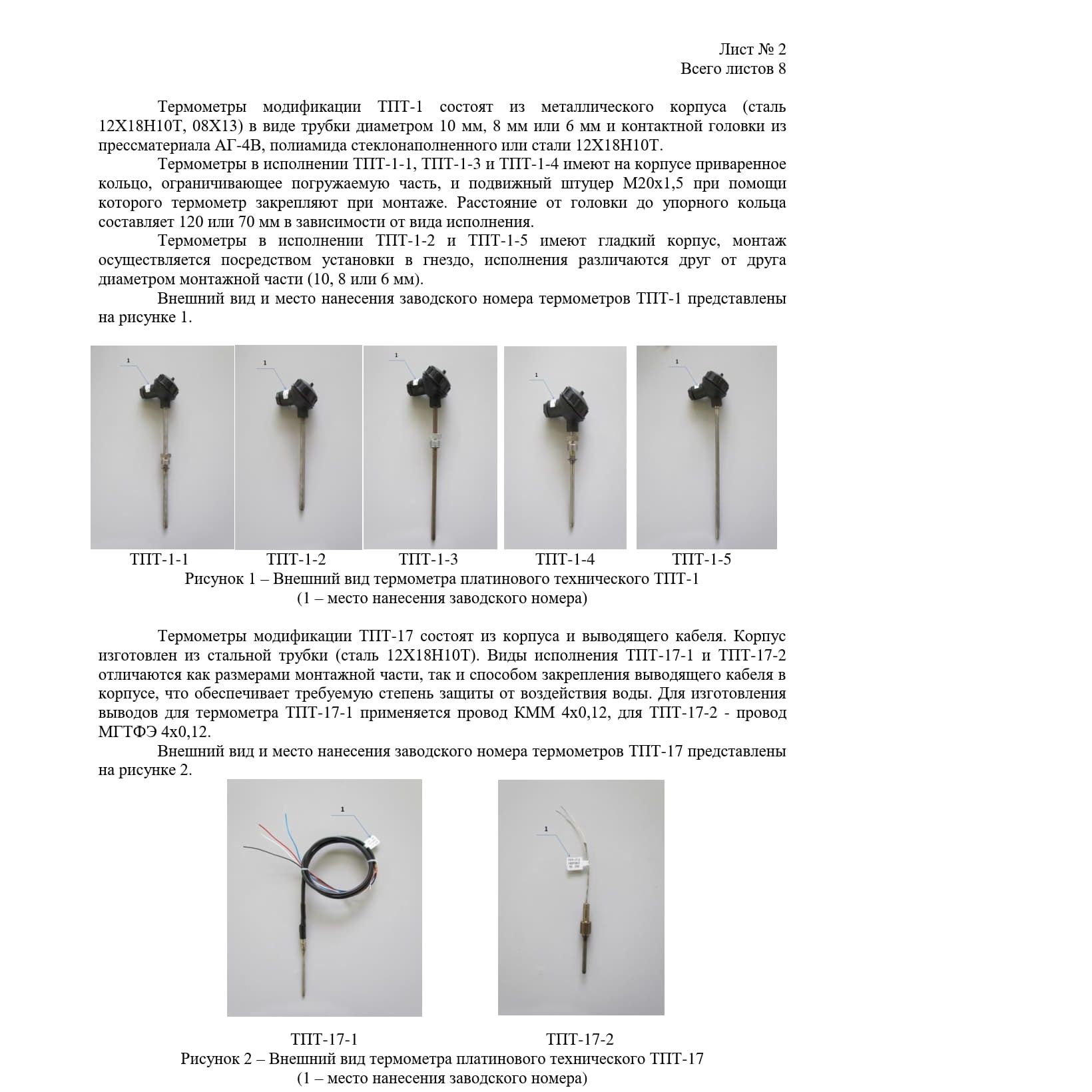 Термометры сопротивления из платины технические ТПТ-1 (далее - термометры) предназначены для измерения температуры твердых тел, жидких и газообразных сред. Описание средства измерений Принцип действия термометров основан на зависимости электрического сопротивления его чувствительного элемента от температуры. Термометры состоят из чувствительного элемента (ЧЭ), помещенного в защитную арматуру (корпус) и элементов подключения к внешней измерительной цепи (клеммной головки, разъема или выводящих проводников). В качестве ЧЭ используются проволочные чувствительные элементы ЧЭПТ-1 или тонкопленочные платиновые сенсоры. Термометры могут изготавливаться с одним или двумя ЧЭ (ТУ 4211-900-17113168-95). Подключение термометров к измерительным устройствам может осуществляться по двух-, трех- или четырехпроводной схеме. Для термометров, предназначенных для измерения температур до плюс 500 °С, монтаж ЧЭ внутри корпуса осуществляется проводниками, выполненными из серебра (С). Для термометров, измеряющих температуру до плюс 300 °С применяются внутренние проводники из провода ПНЭТ-имид (Н).