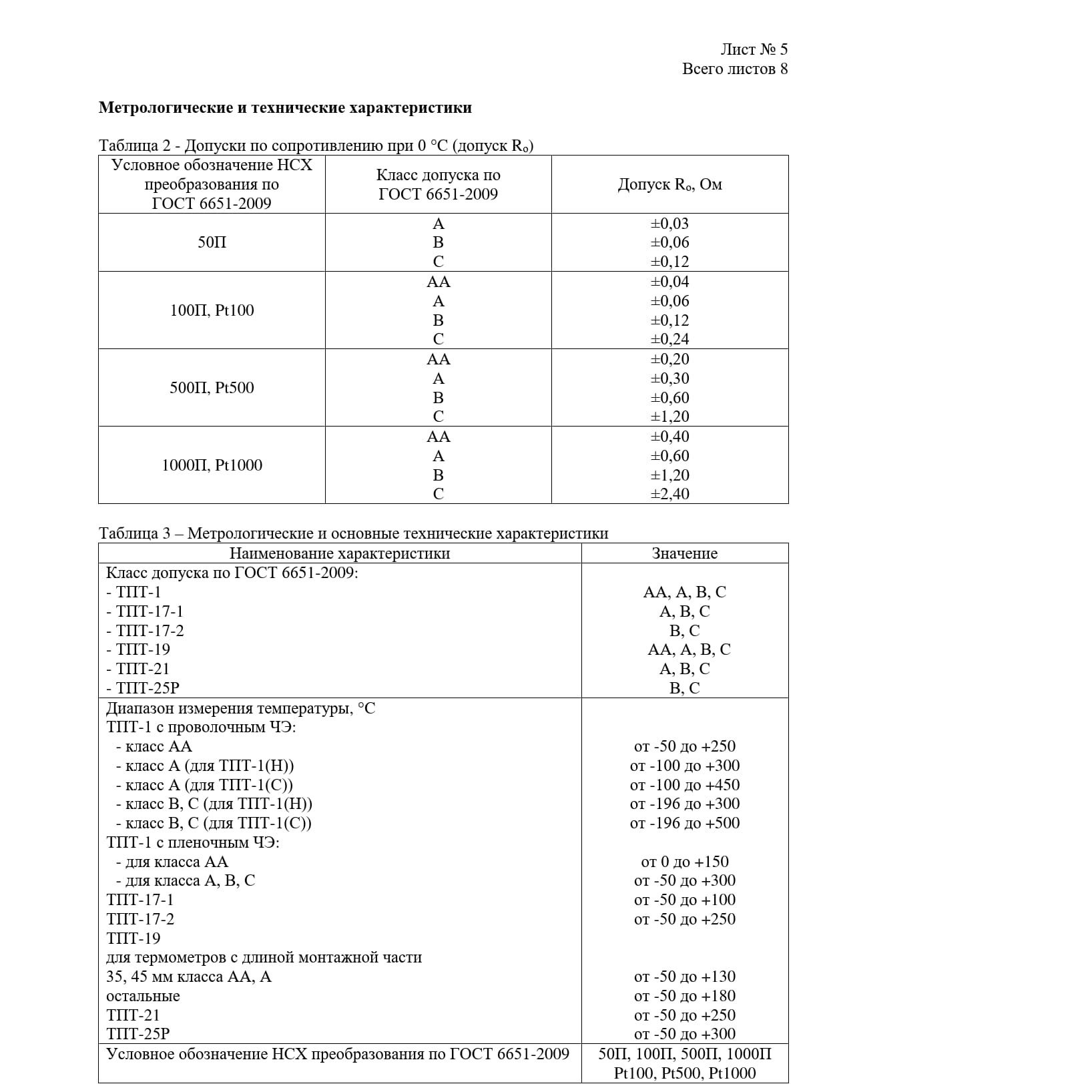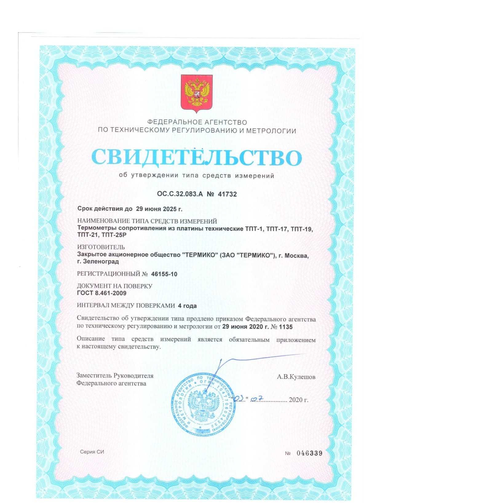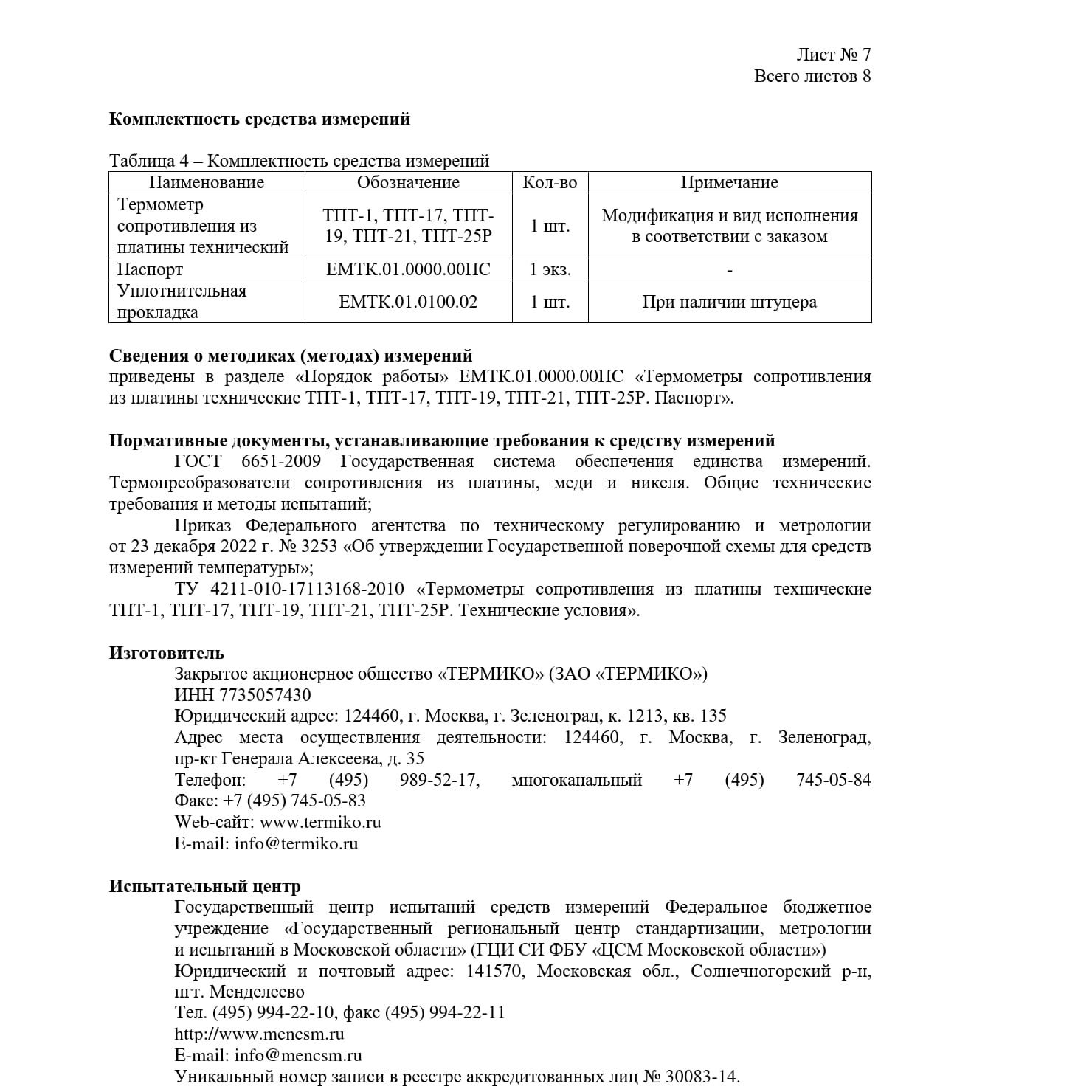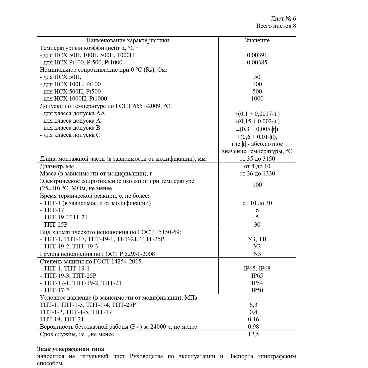 Термометры сопротивления из платины технические ТПТ-1 (далее - термометры) предназначены для измерения температуры твердых тел, жидких и газообразных сред. Описание средства измерений Принцип действия термометров основан на зависимости электрического сопротивления его чувствительного элемента от температуры. Термометры состоят из чувствительного элемента (ЧЭ), помещенного в защитную арматуру (корпус) и элементов подключения к внешней измерительной цепи (клеммной головки, разъема или выводящих проводников). В качестве ЧЭ используются проволочные чувствительные элементы ЧЭПТ-1 или тонкопленочные платиновые сенсоры. Термометры могут изготавливаться с одним или двумя ЧЭ (ТУ 4211-900-17113168-95). Подключение термометров к измерительным устройствам может осуществляться по двух-, трех- или четырехпроводной схеме. Для термометров, предназначенных для измерения температур до плюс 500 °С, монтаж ЧЭ внутри корпуса осуществляется проводниками, выполненными из серебра (С). Для термометров, измеряющих температуру до плюс 300 °С применяются внутренние проводники из провода ПНЭТ-имид (Н).