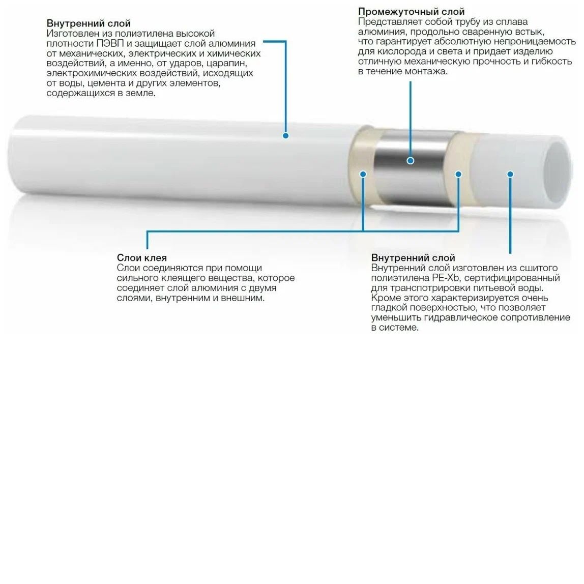 Металлопластиковая труба PEX-c 32х3 мм является трубой универсального применения: для питьевого водоснабжения, отопления, в т.ч., напольного, газа, мазута, дождевой воды и для других сфер. Металлопластиковые трубы состоят из сваренных в стык алюминиевых труб с внутренними и внешними слоями полиэтилена, сшитых с помощью электронных лучей. Слои соединены между собой с помощью высококачественного клея. Алюминиевая труба гарантирует, что труба не пропускает кислород и сохраняет свою форму. Стыковой сварной шов по всей длине алюминиевой трубы обеспечивает постоянную толщину алюминия. Сшивка многократно повышает качество полиэтилена. При этом повышается сопротивление трубы воздействиям давления и температуры. Труба соответствует самым строгим требованиям для установок питьевой воды, она устойчива к агрессивным веществам.