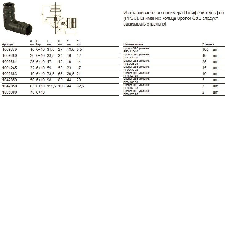 Угольник Uponor Q&E PPSU 90* 32х32 (1001245). Для труб из сшитого полиэтилена. ( кольца Q&E в комплект не входят)